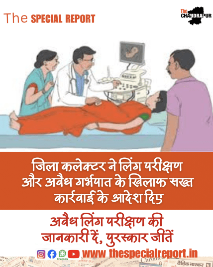 जिला कलेक्टर ने लिंग परीक्षण और अवैध गर्भपात के खिलाफ सख्त कार्रवाई के आदेश दिए अवैध लिंग परीक्षण की जानकारी दें, पुरस्कार जीतें चंद्रपुर, दिनांक 9: गर्भधारण पूर्व और प्रसव पूर्व निदान तकनीकों का उपयोग करके अवैध लिंग परीक्षण और गर्भपात कानूनन अपराध है। जिला कलेक्टर विनय गौड़ा जी.सी. ने ऐसा करने वालों के खिलाफ