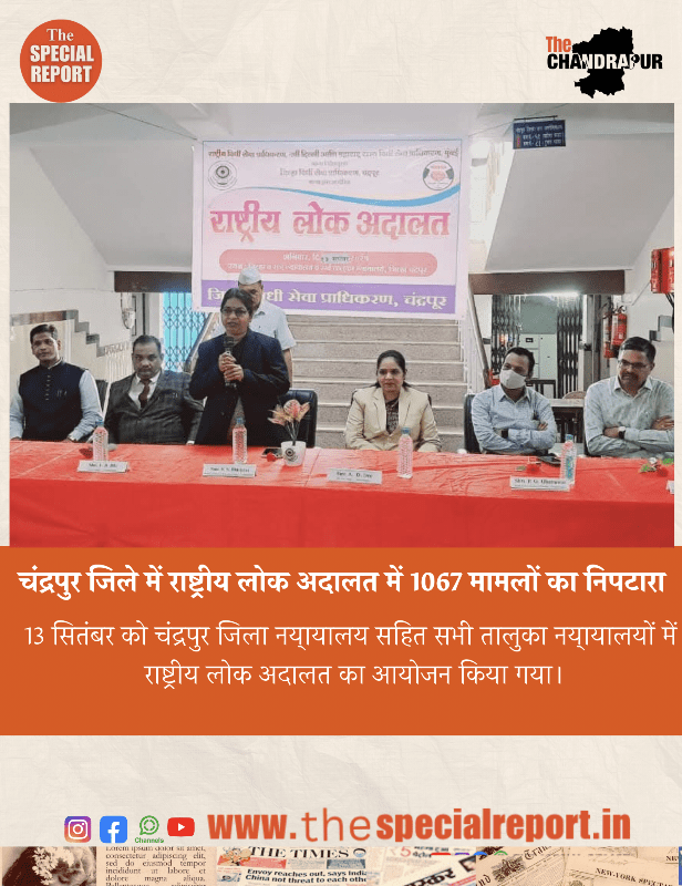 चंद्रपुर जिले में राष्ट्रीय लोक अदालत में 1067 मामलों का निपटारा चंद्रपुर, 13 सितंबर: राष्ट्रीय विधिक सेवा प्राधिकरण, नई दिल्ली और महाराष्ट्र राज्य विधिक सेवा प्राधिकरण, मुंबई के निर्देशानुसार, 13 सितंबर को चंद्रपुर जिला न्यायालय सहित सभी तालुका न्यायालयों में राष्ट्रीय लोक अदालत का आयोजन किया गया। इस लोक अदालत का उद्घाटन मुख्य जिला एवं