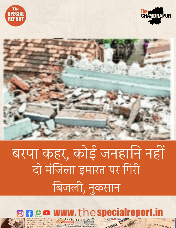 मौसमः बरपा कहर, कोई जनहानि नहीं दो मंजिला इमारत पर गिरी बिजली, नुकसान राजुरा, (सं.) भारी बारिश के दौरान, सास्ती गांव निवासी सुरेश विश्वनाथ काले के दो मंजिला मकान पर बिजली गिरी. इससे मकान और घरेलू सामान को भारी नुकसान हुआ. गनीमत रही कि कोई जनहानि नहीं हुई. यह घटना शनिवार (13 सितंबर) की रात