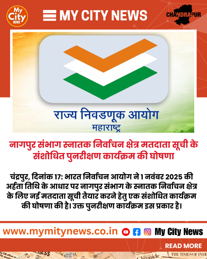 नागपुर संभाग स्नातक निर्वाचन क्षेत्र मतदाता सूची के संशोधित पुनरीक्षण कार्यक्रम की घोषणा चंद्रपुर, दिनांक 17: भारत निर्वाचन आयोग ने 1 नवंबर 2025 की अर्हता तिथि के आधार पर नागपुर संभाग के स्नातक निर्वाचन क्षेत्र के लिए नई मतदाता सूची तैयार करने हेतु एक संशोधित कार्यक्रम की घोषणा की है। उक्त पुनरीक्षण कार्यक्रम इस प्रकार
