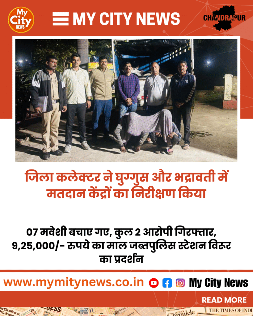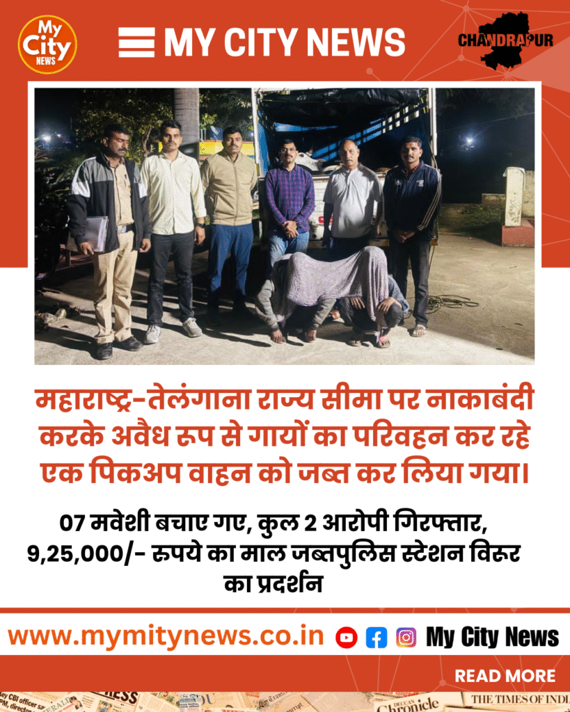 07 मवेशी बचाए गए, कुल 2 आरोपी गिरफ्तार, 9,25,000/- रुपये का माल जब्त पुलिस स्टेशन विरूर का प्रदर्शन 26 नवंबर 2025 को विरूर पुलिस सीमा में गश्त के दौरान गोपनीय सूचना के आधार पर महाराष्ट्र-तेलंगाना राज्य सीमा पर अंतरगांव वन क्षेत्र में वन निरीक्षण चौकी पर एक महिंद्रा बोलेरो पिकअप वाहन क्रमांक MH34-BZ-7691 को रोका