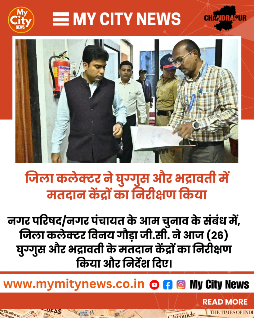 चंद्रपुर, दिनांक 26: नगर परिषद/नगर पंचायत के आम चुनाव के संबंध में, जिला कलेक्टर विनय गौड़ा जी.सी. ने आज (26) घुग्गुस और भद्रावती के मतदान केंद्रों का निरीक्षण किया और निर्देश दिए। नगर परिषद/नगर पंचायत के आम चुनाव के संबंध में, जिला कलेक्टर विनय गौड़ा जी.सी. ने आज (26) घुग्गुस और भद्रावती के मतदान केंद्रों