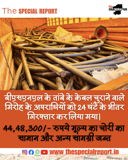 ⭕बीएसएनएल के तांबे के केबल चुराने वाले गिरोह के अपराधियों को 24 घंटे के भीतर गिरफ्तार कर लिया गया। स्थानीय अपराध शाखा, चंद्रपुर की कामगिरी 44,48,300/- रुपये मूल्य का चोरी का सामान और अन्य सामग्री जब्त दिनांक 08/09/2025 को शिकायतकर्ता श्री अभिजीत अशोक जीवने, उम्र 45 वर्ष, निवासी नगीनाबाग चंद्रपुर (जूनियर इंजीनियर, दूरसंचार विभाग, चंद्रपुर) […]