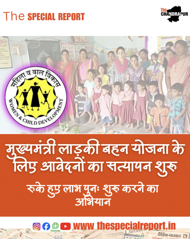 चंद्रपुर, : महिलाओं के स्वास्थ्य और पोषण में सुधार, उनकी आर्थिक आत्मनिर्भरता और परिवार में उनकी निर्णायक भूमिका को मज़बूत करने के लिए ‘मुख्यमंत्री माझी लड़की बहन’ योजना शुरू की गई है। ज़िला स्तर पर इस योजना के लाभार्थियों की आयु सत्यापन सूची और एक परिवार में दो से अधिक लाभार्थियों की सूची सरकार से प्राप्त हो गई है।